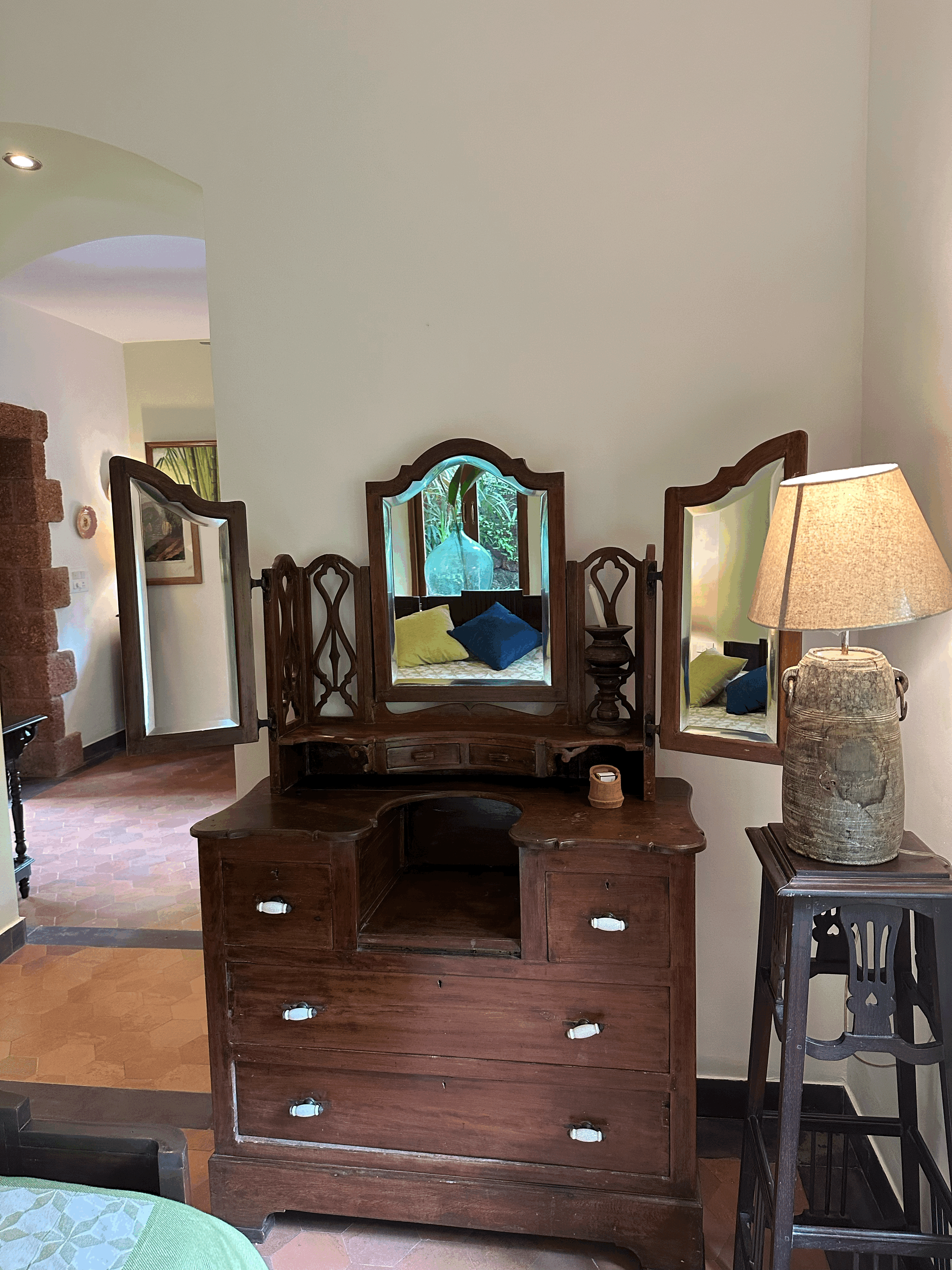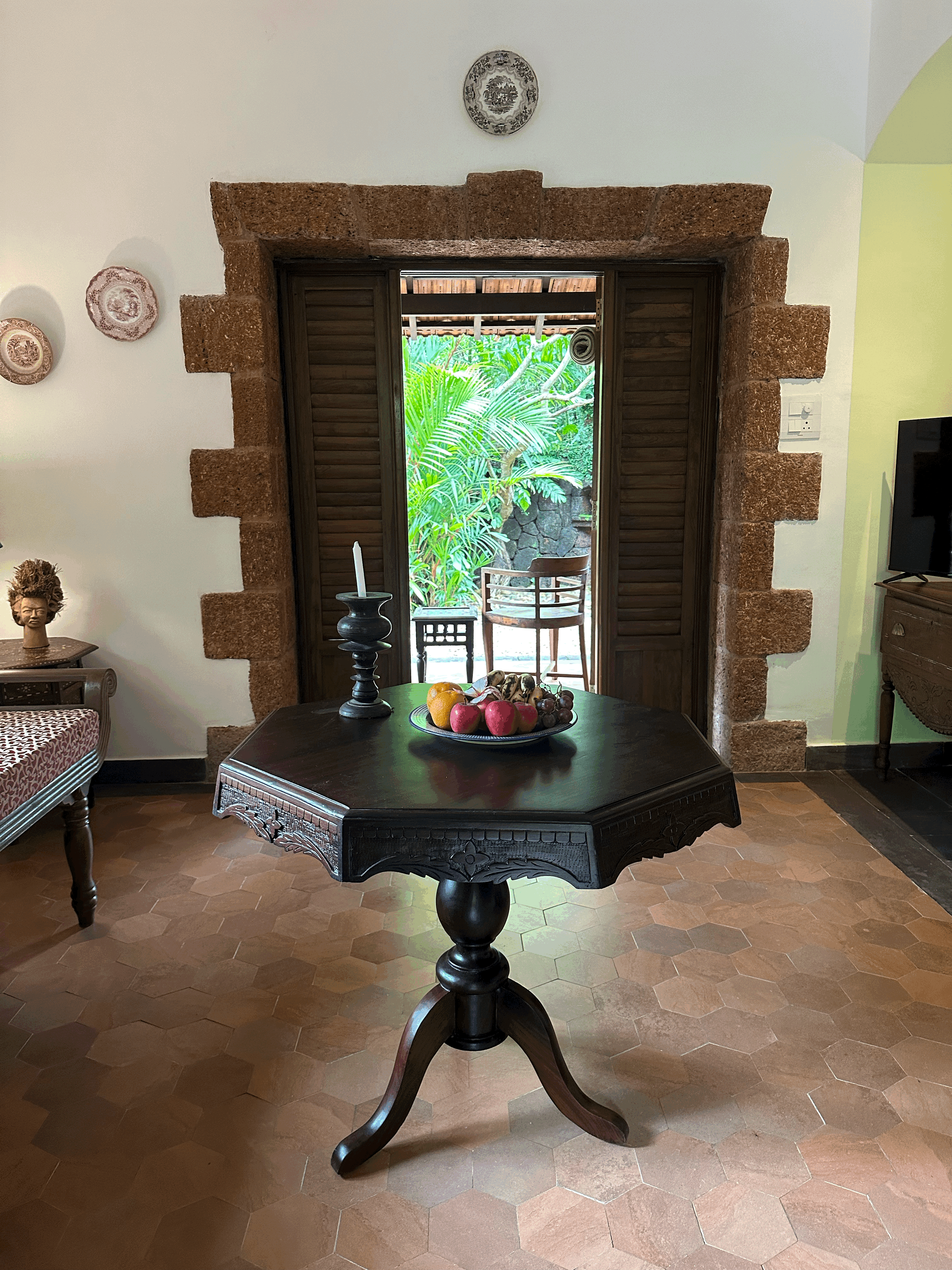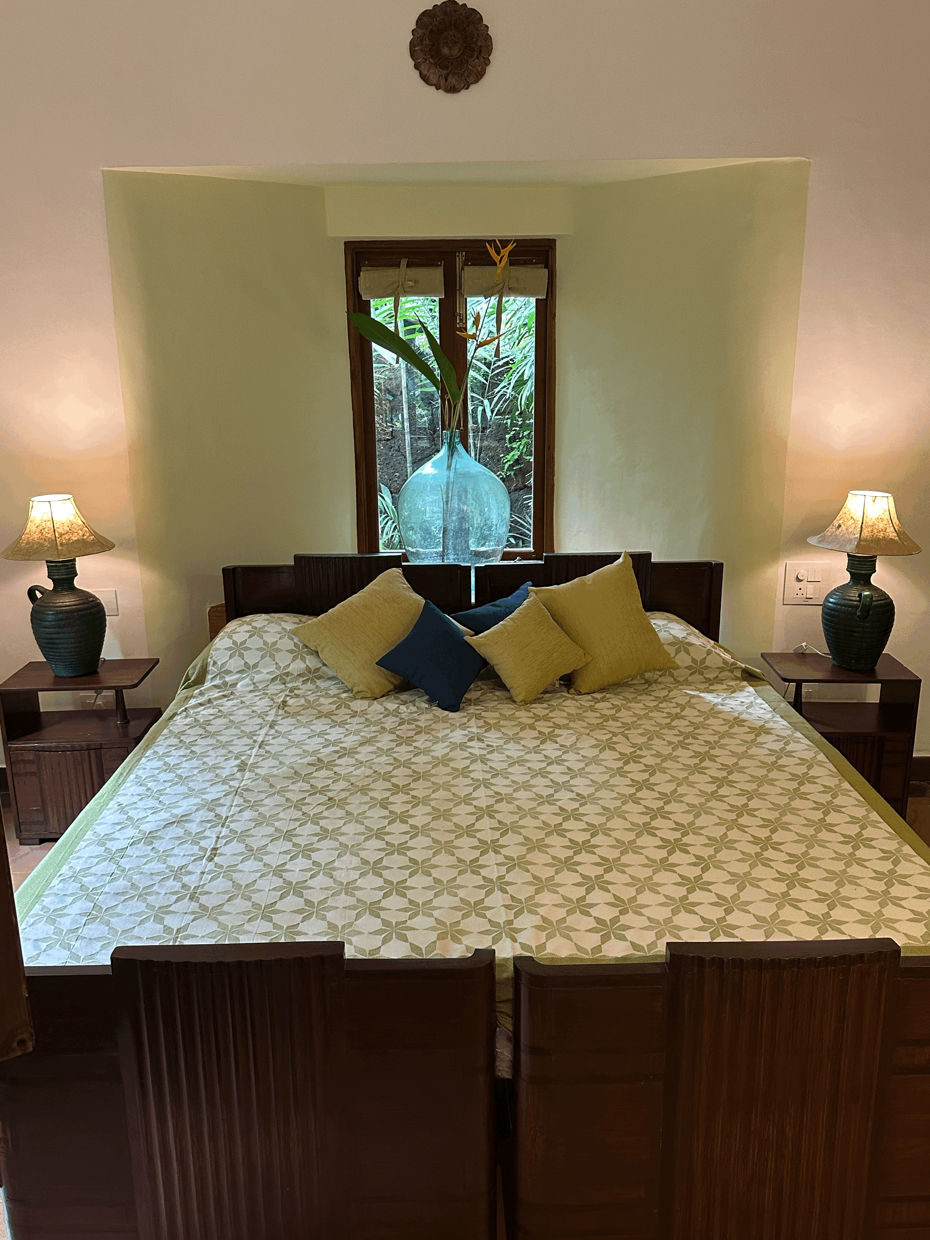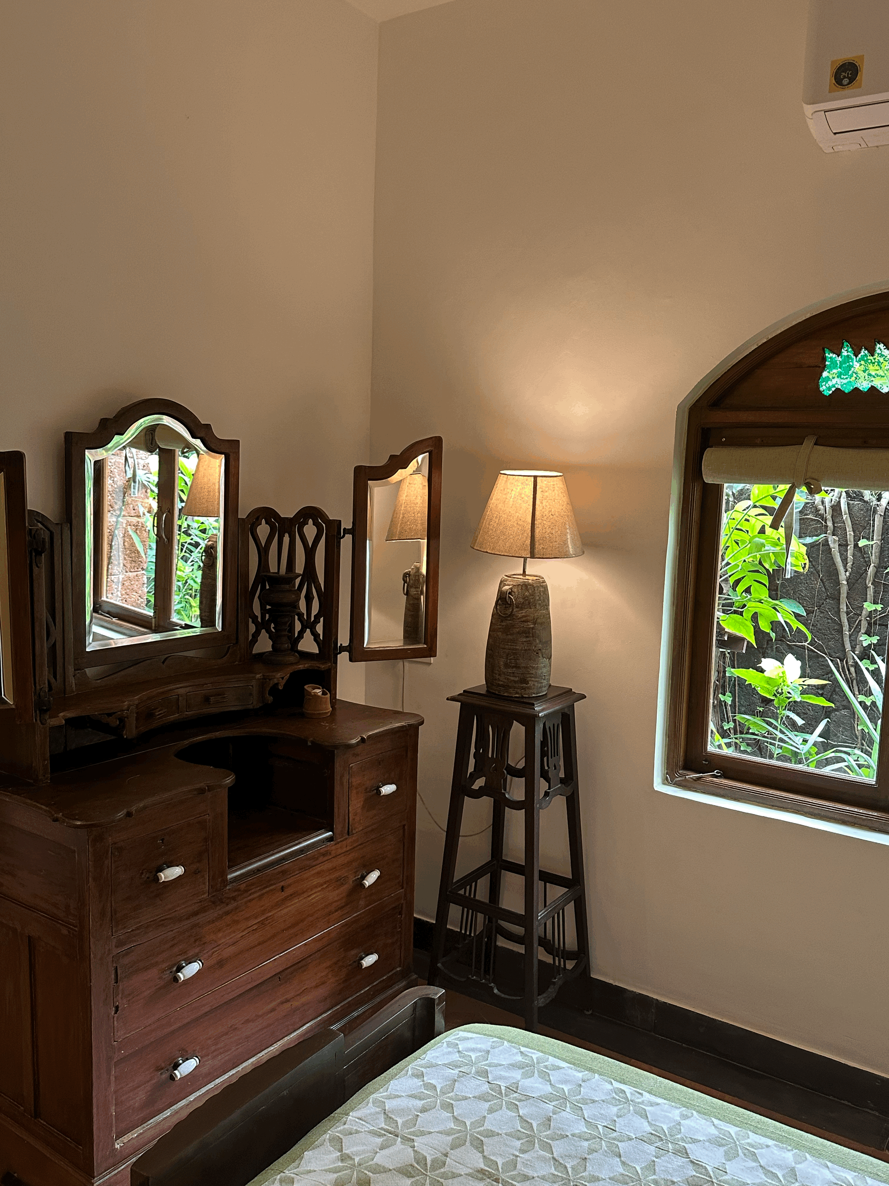 Welcome to the Bamboo Suite – a thoughtfully designed space where heritage and nature come together seamlessly. This suite features hand-carved wooden furniture, including a classic slatted diwan positioned by a large garden-facing window, perfect for lounging or enjoying a quiet read in the soft daylight. The spacious bedroom is anchored by a solid Art Deco king-sized bed, complemented by a vintage dresser and ceramic-lit side tables. Antique details like floral-tiled mirrors and a Goan-Portuguese rosewood wardrobe enrich the suite’s old-world charm and reflect the region’s layered history. Sunlight pours in through graceful arched windows, offering calming views of the surrounding greenery, while warm terracotta flooring adds an earthy, grounded elegance to the space. The suite also features two outdoor balconies, one of which overlooks the tranquil pond, providing perfect spots to relax and soak in the natural beauty. The Bamboo Suite is a tranquil blend of comfort and nostalgia, an ideal retreat for those seeking peace, heritage charm, and a deep connection to nature.