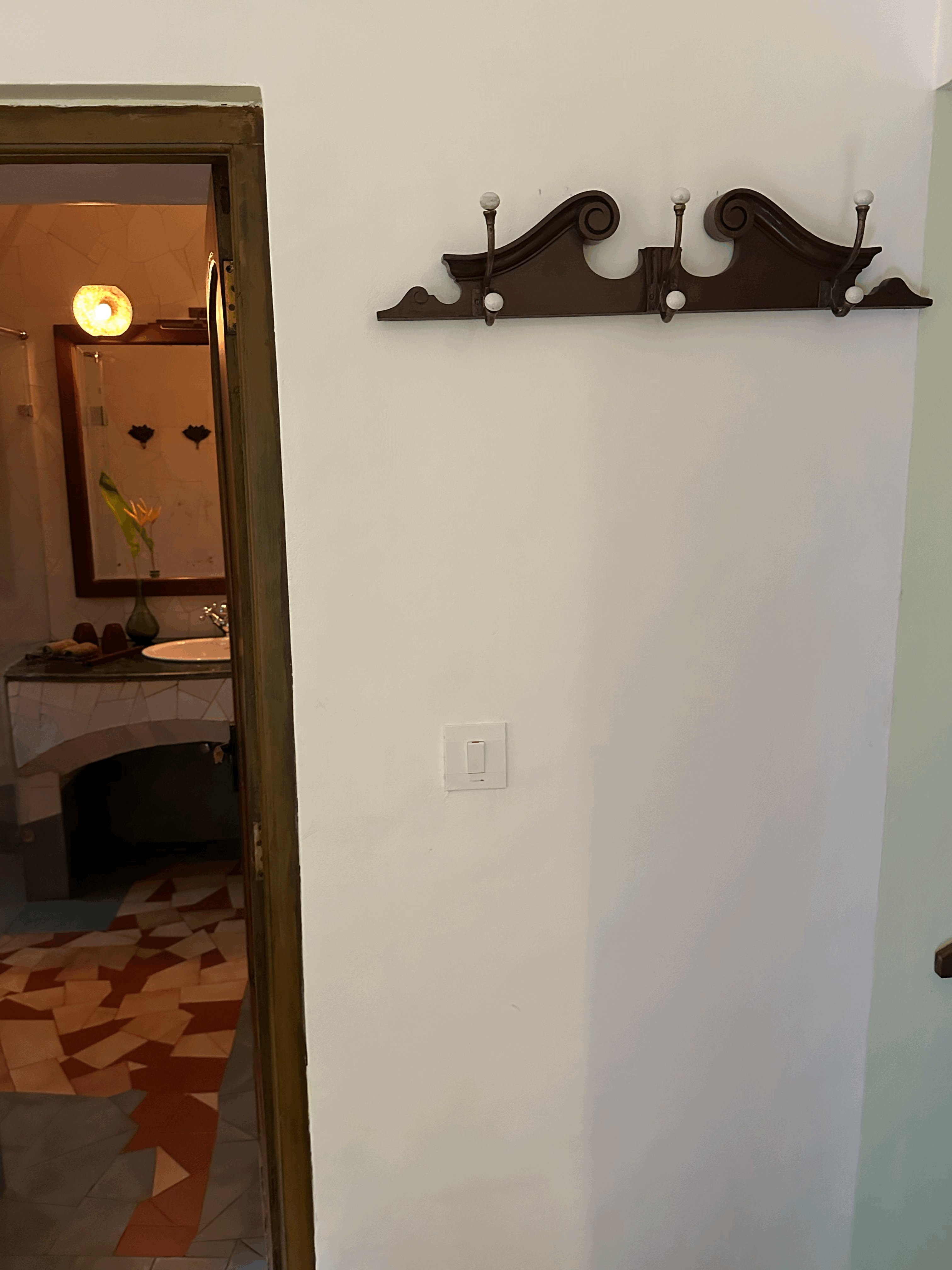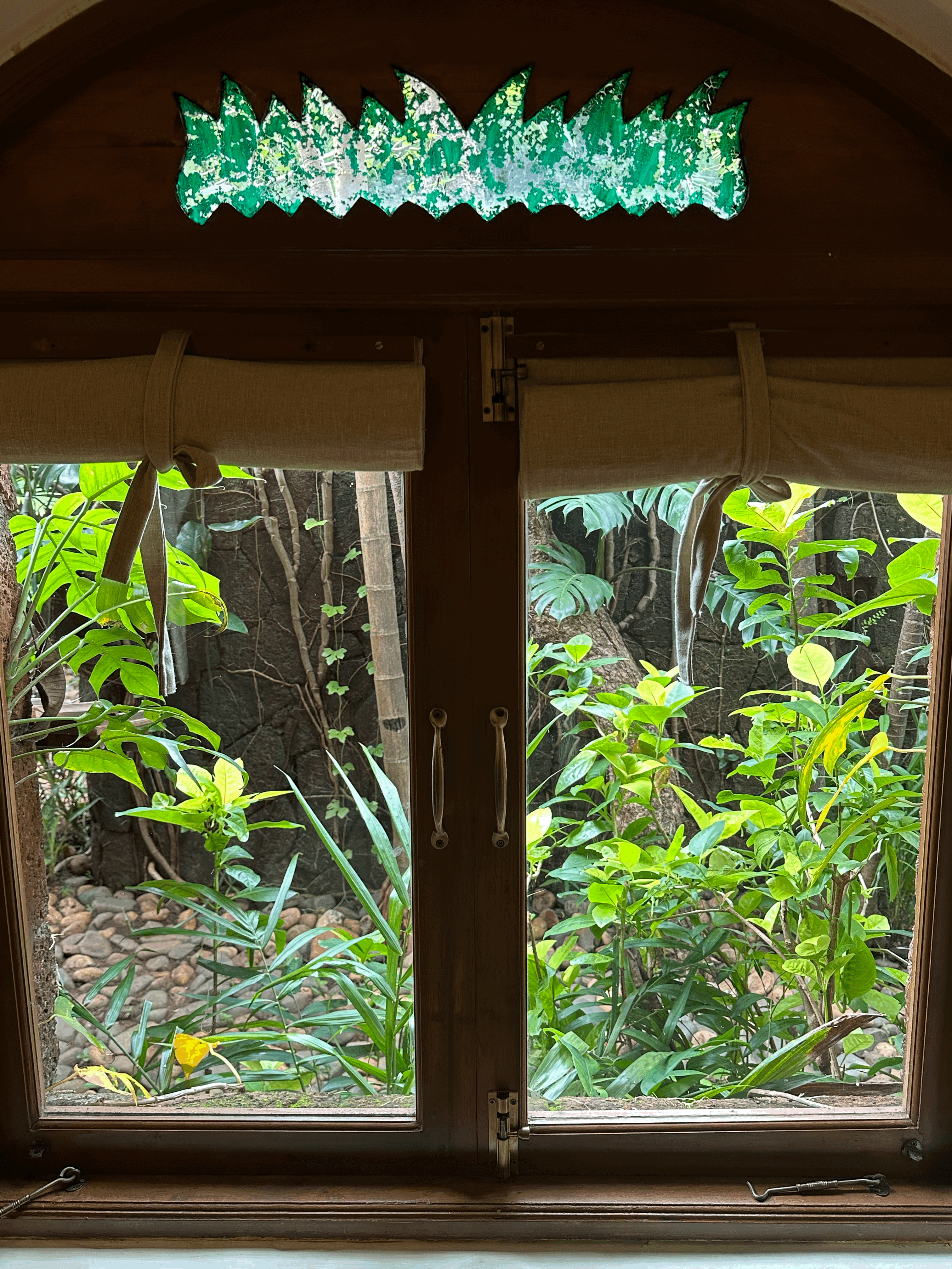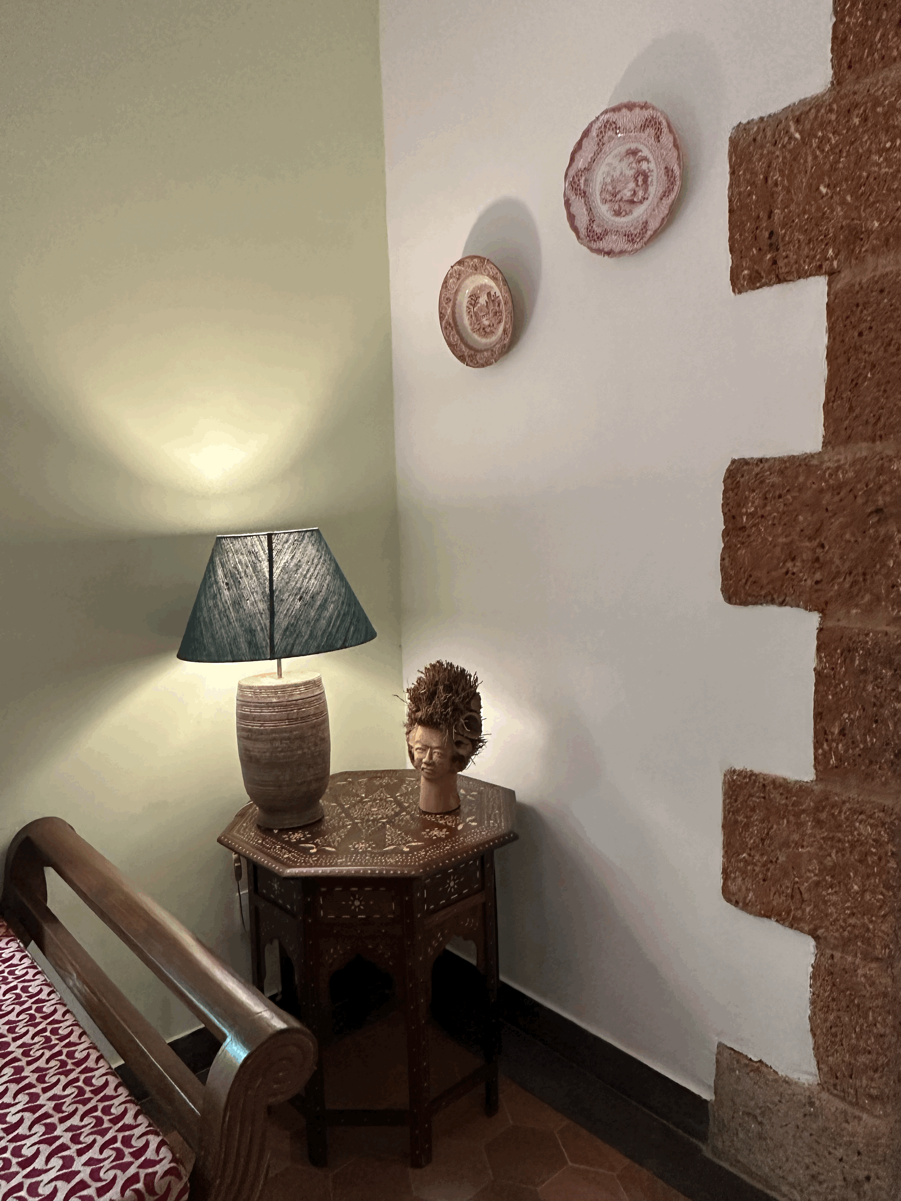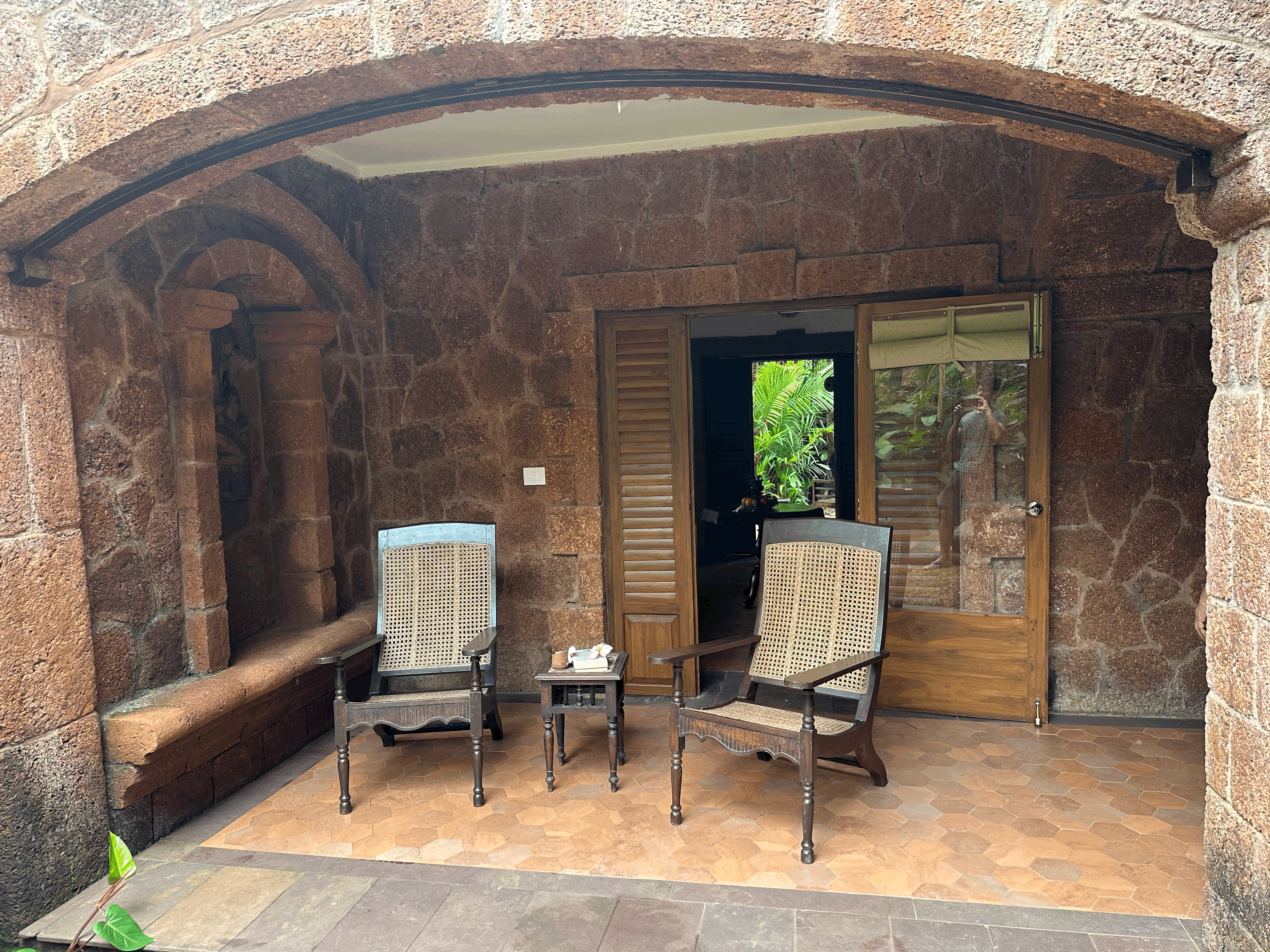 Welcome to the Bamboo Suite – a thoughtfully designed space where heritage and nature come together seamlessly. This suite features hand-carved wooden furniture, including a classic slatted diwan positioned by a large garden-facing window, perfect for lounging or enjoying a quiet read in the soft daylight. The spacious bedroom is anchored by a solid Art Deco king-sized bed, complemented by a vintage dresser and ceramic-lit side tables. Antique details like floral-tiled mirrors and a Goan-Portuguese rosewood wardrobe enrich the suite’s old-world charm and reflect the region’s layered history. Sunlight pours in through graceful arched windows, offering calming views of the surrounding greenery, while warm terracotta flooring adds an earthy, grounded elegance to the space. The suite also features two outdoor balconies, one of which overlooks the tranquil pond, providing perfect spots to relax and soak in the natural beauty. The Bamboo Suite is a tranquil blend of comfort and nostalgia, an ideal retreat for those seeking peace, heritage charm, and a deep connection to nature.