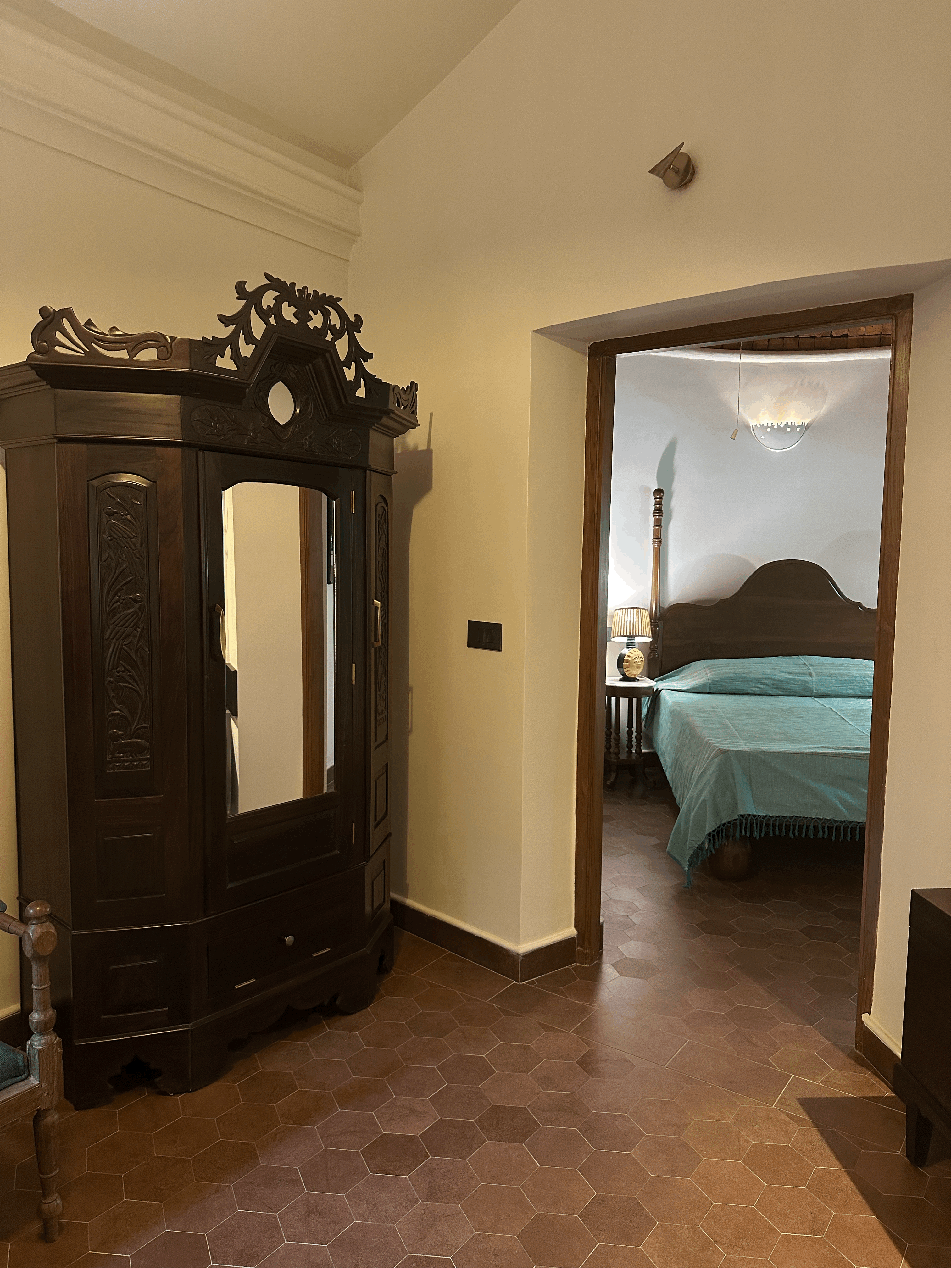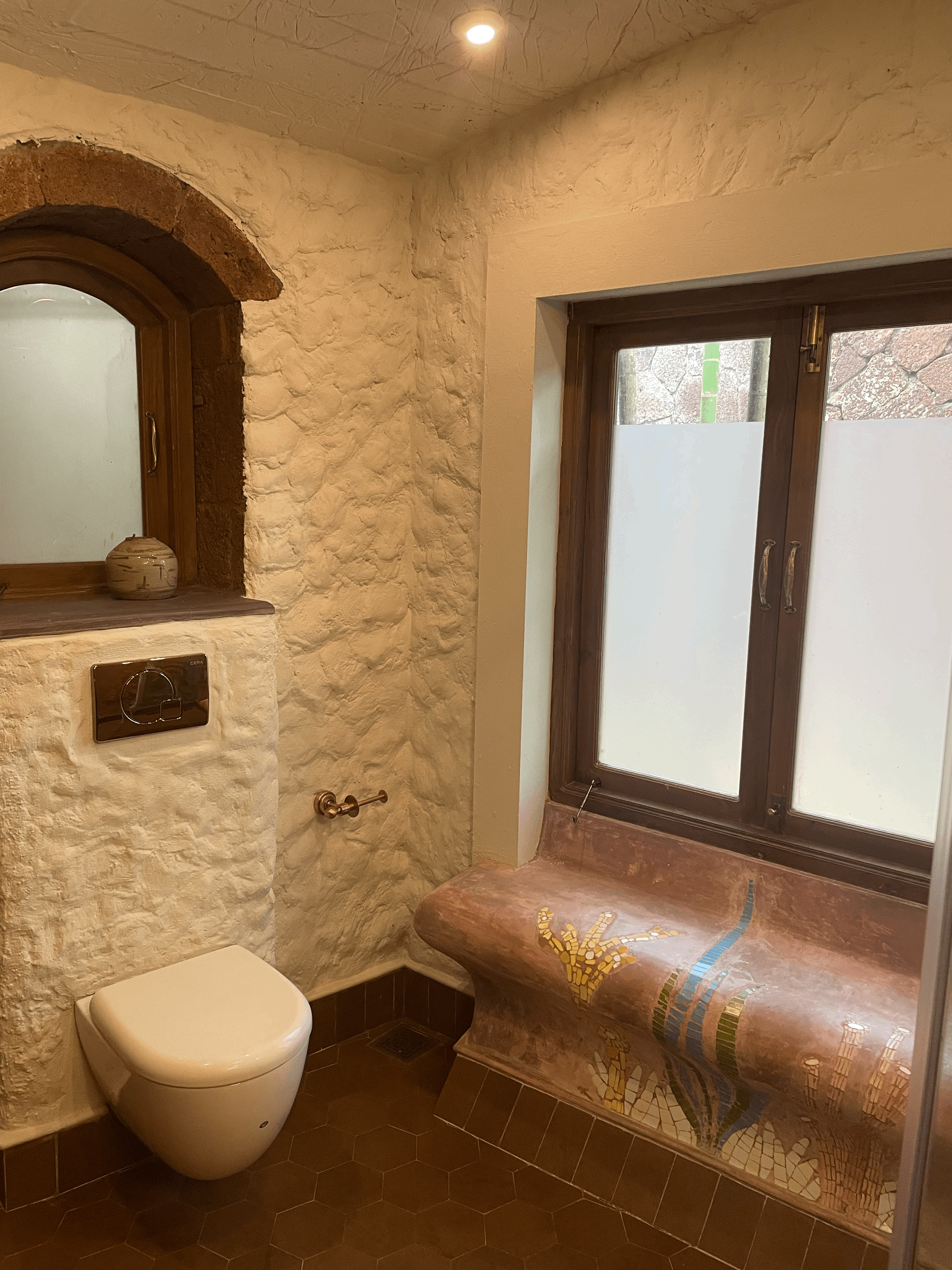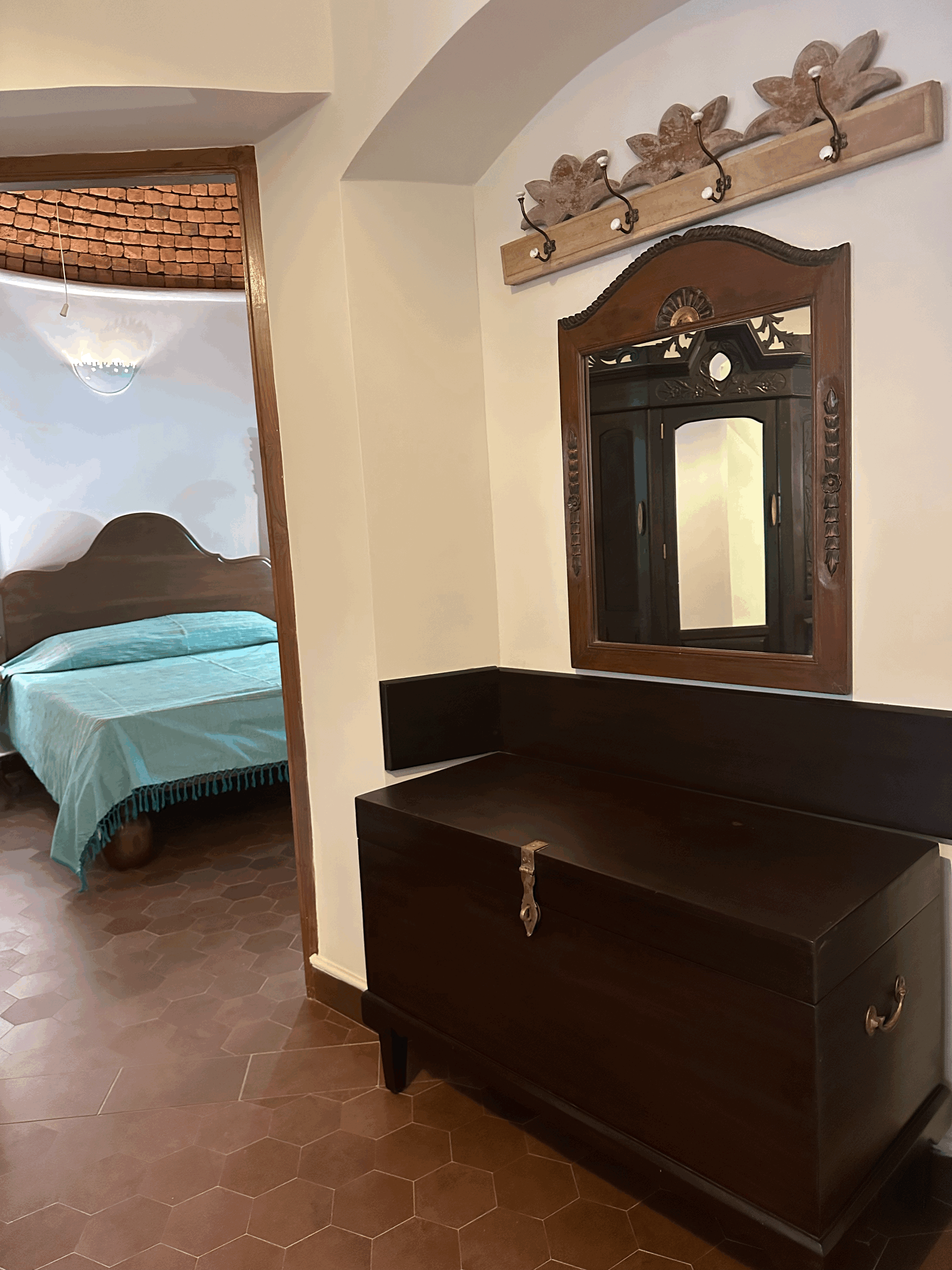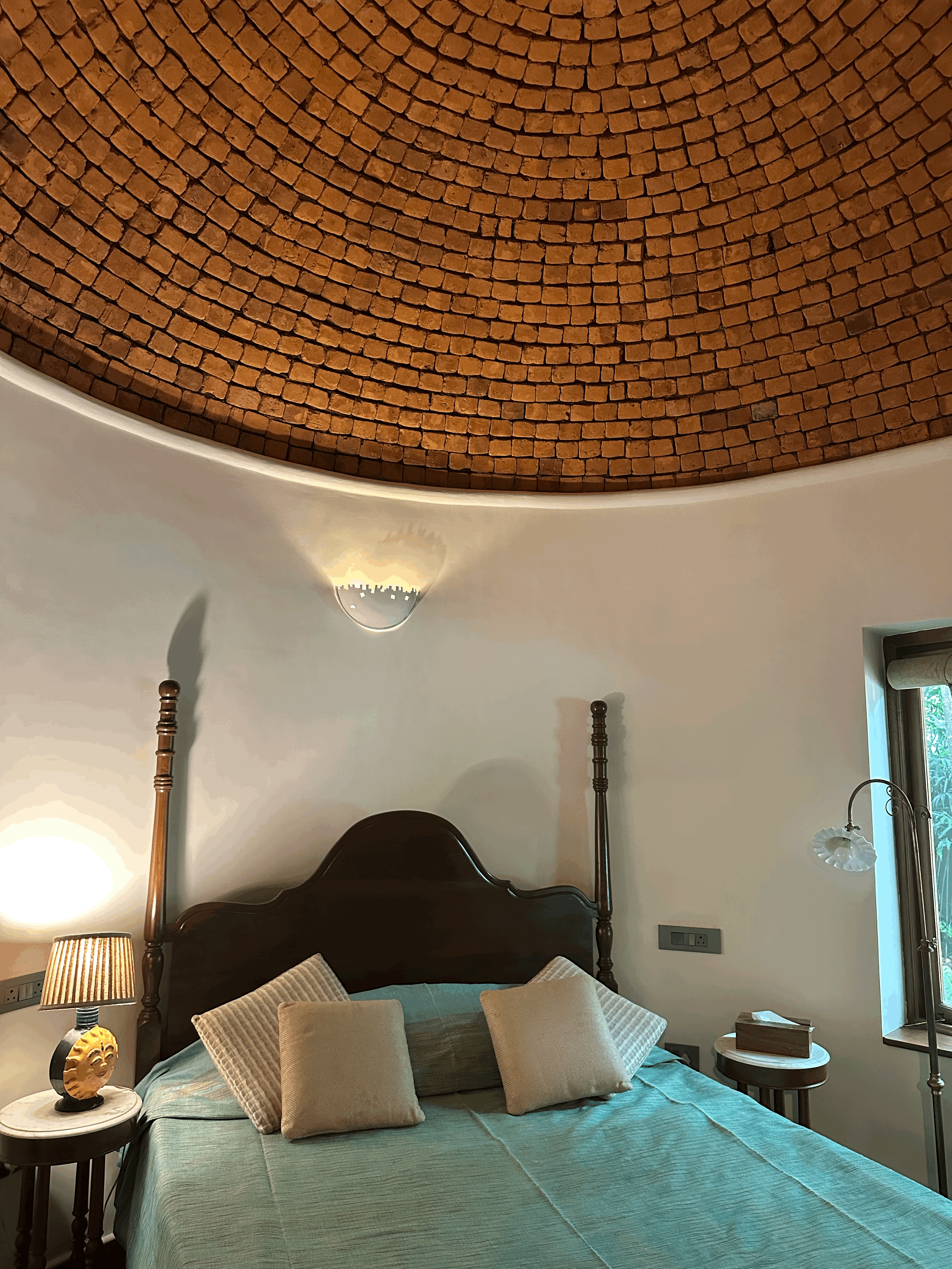 The Coral Suite invites you into a cozy, free-flowing room where elegance meets comfort. Featuring a graceful two-poster bed and carved wooden seating with deep blue cushions, the space balances antique richness with soft minimalism. Natural light filters through wood-framed windows, adding warmth and serenity to this refined coastal retreat. This ground-floor suite overlooks the swimming pool and includes a balcony that also faces the pool, providing a tranquil spot to relax and enjoy the view. The bedroom is crowned with a unique brick-clad dome-shaped ceiling, adding character and charm to the space. The bathroom features a beautiful coral reef-inspired mosaic tile design, meticulously laid into in situ concrete walls, blending artistry with modern craftsmanship.