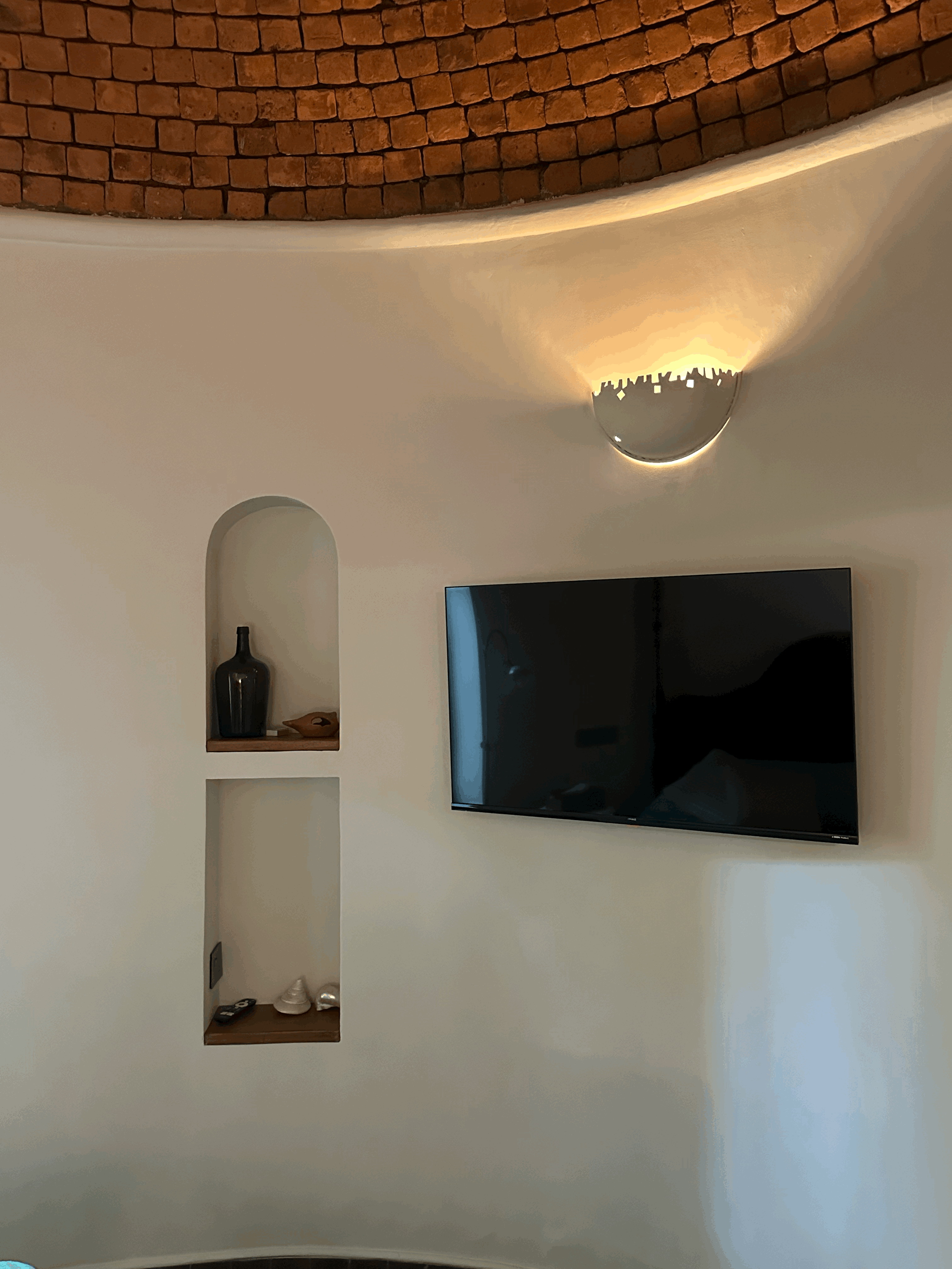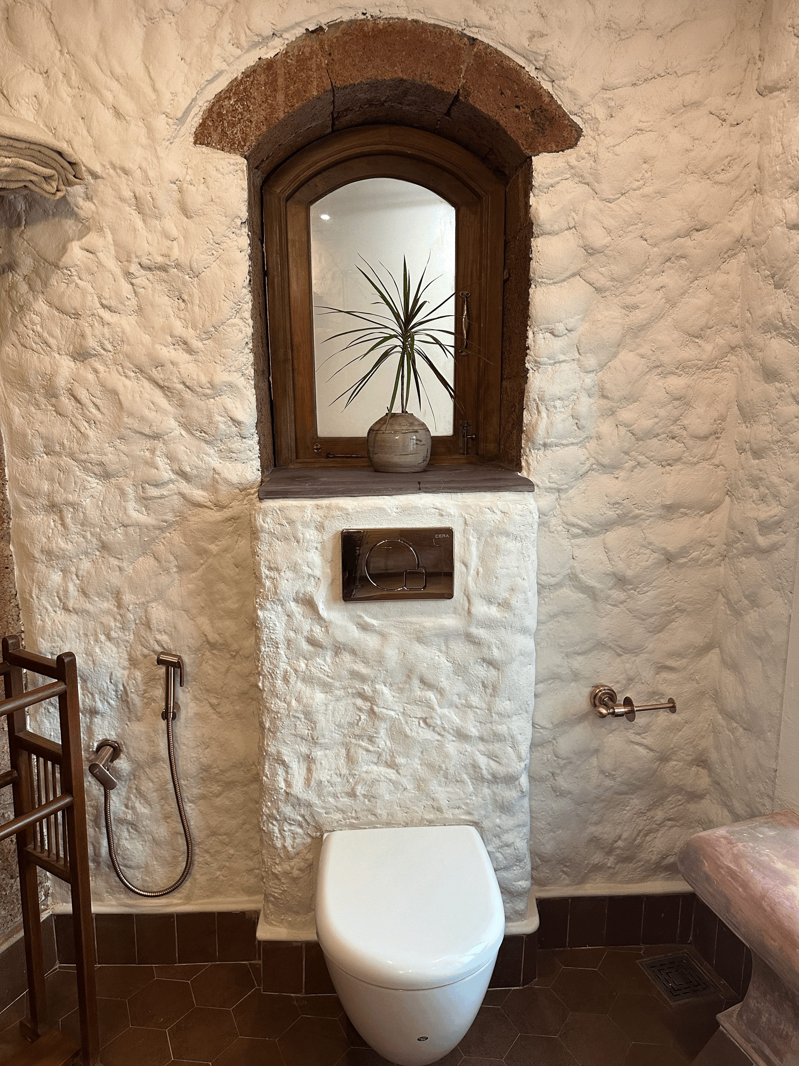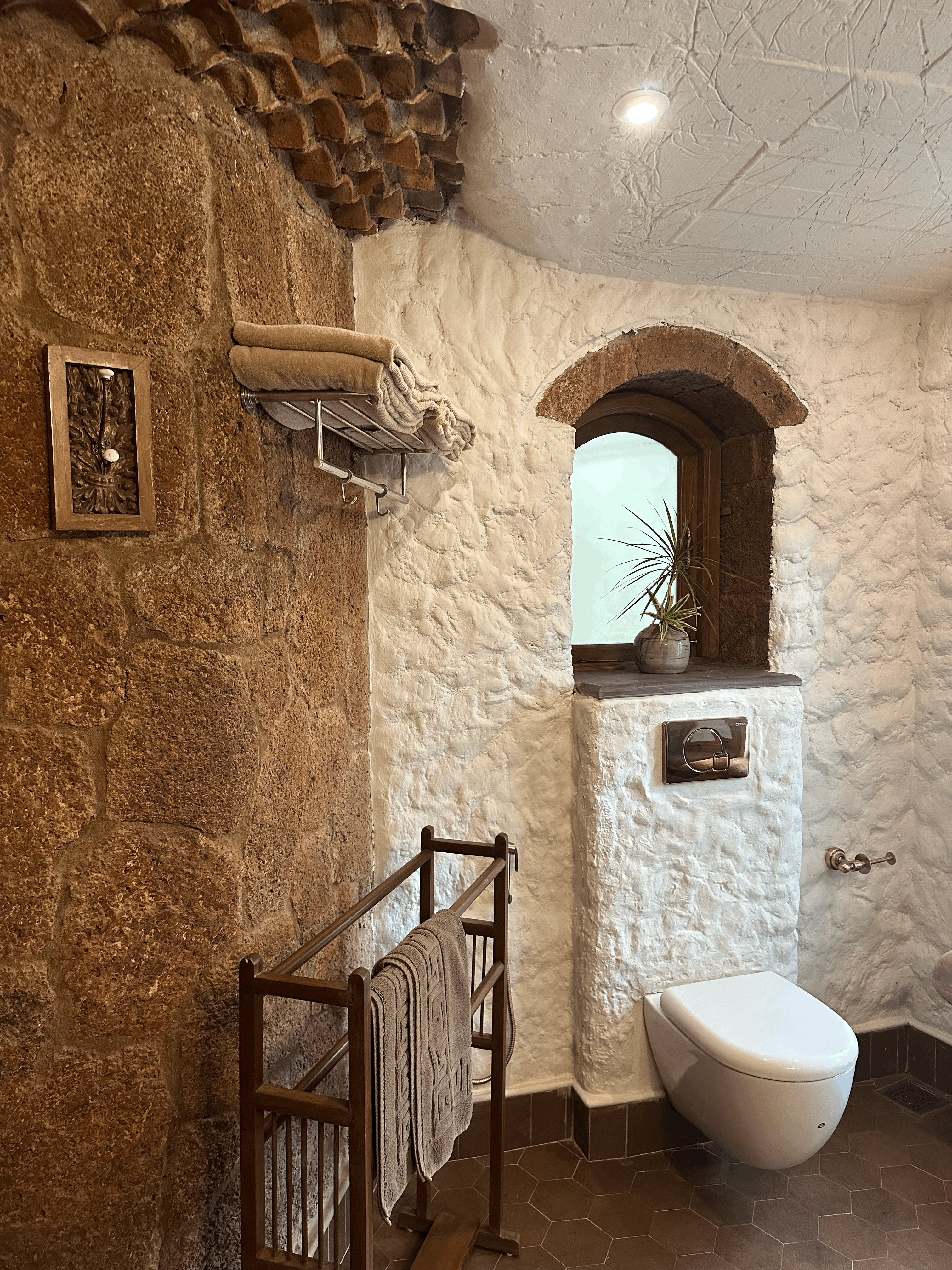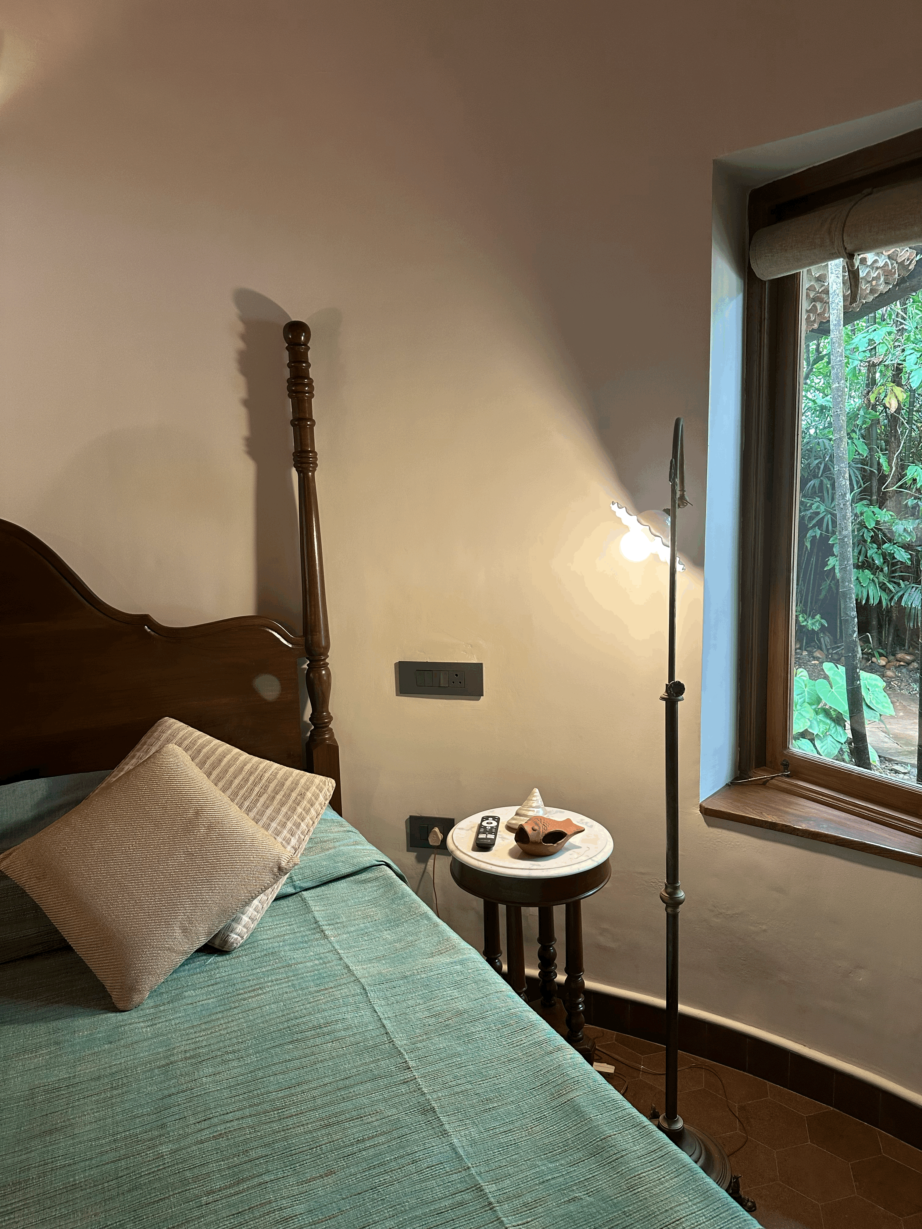 The Coral Suite invites you into a cozy, free-flowing room where elegance meets comfort. Featuring a graceful two-poster bed and carved wooden seating with deep blue cushions, the space balances antique richness with soft minimalism. Natural light filters through wood-framed windows, adding warmth and serenity to this refined coastal retreat. This ground-floor suite overlooks the swimming pool and includes a balcony that also faces the pool, providing a tranquil spot to relax and enjoy the view. The bedroom is crowned with a unique brick-clad dome-shaped ceiling, adding character and charm to the space. The bathroom features a beautiful coral reef-inspired mosaic tile design, meticulously laid into in situ concrete walls, blending artistry with modern craftsmanship.