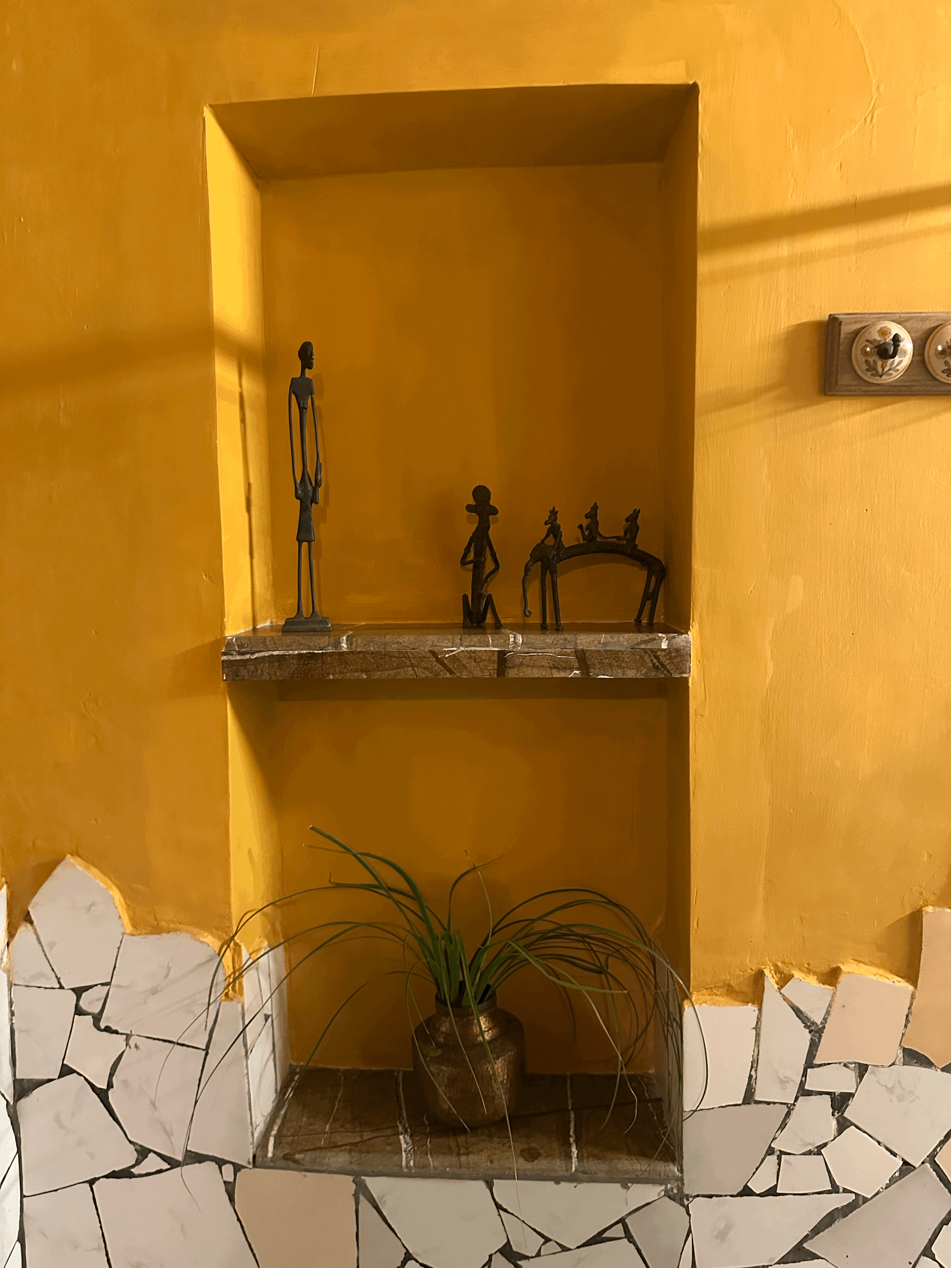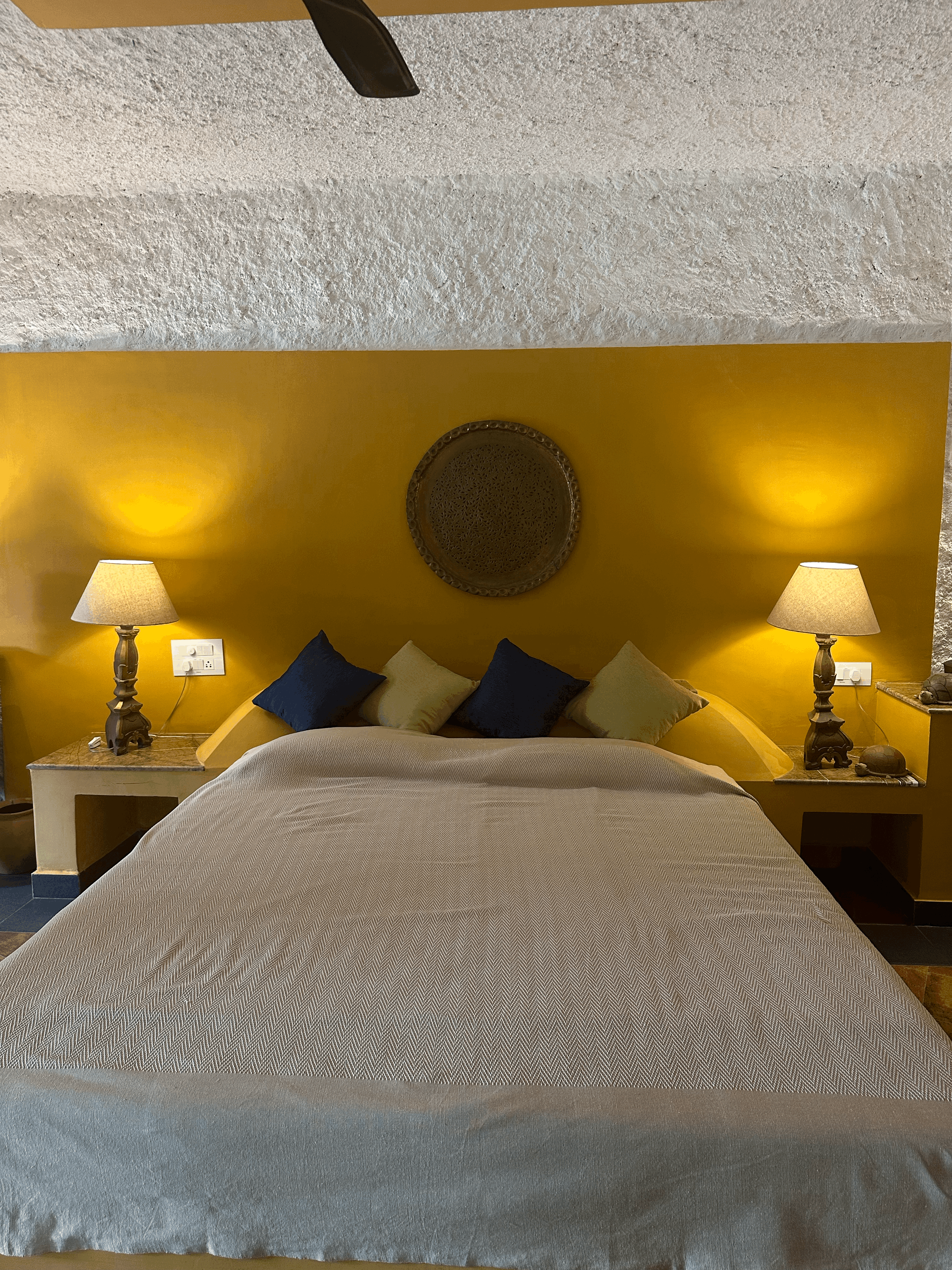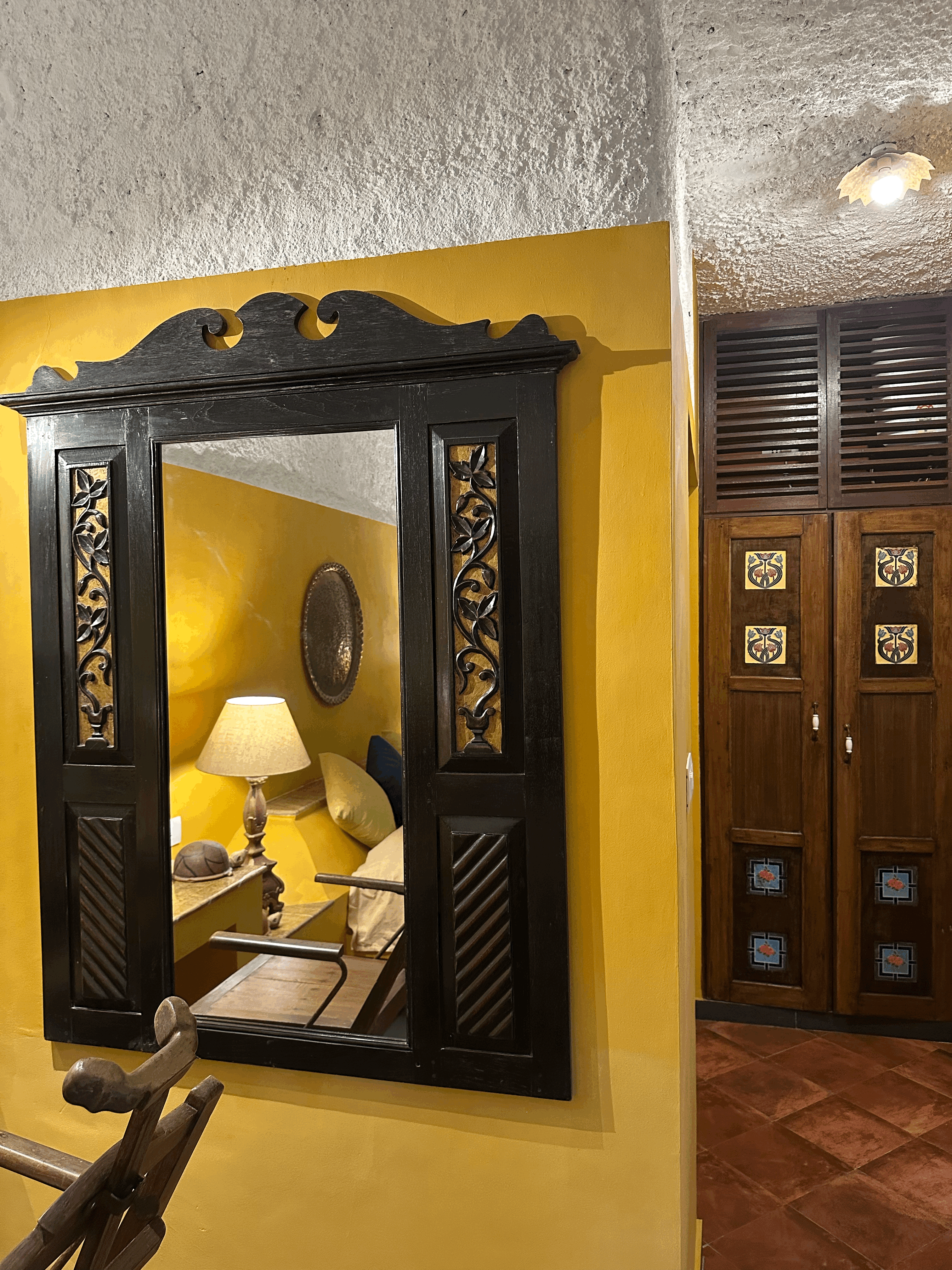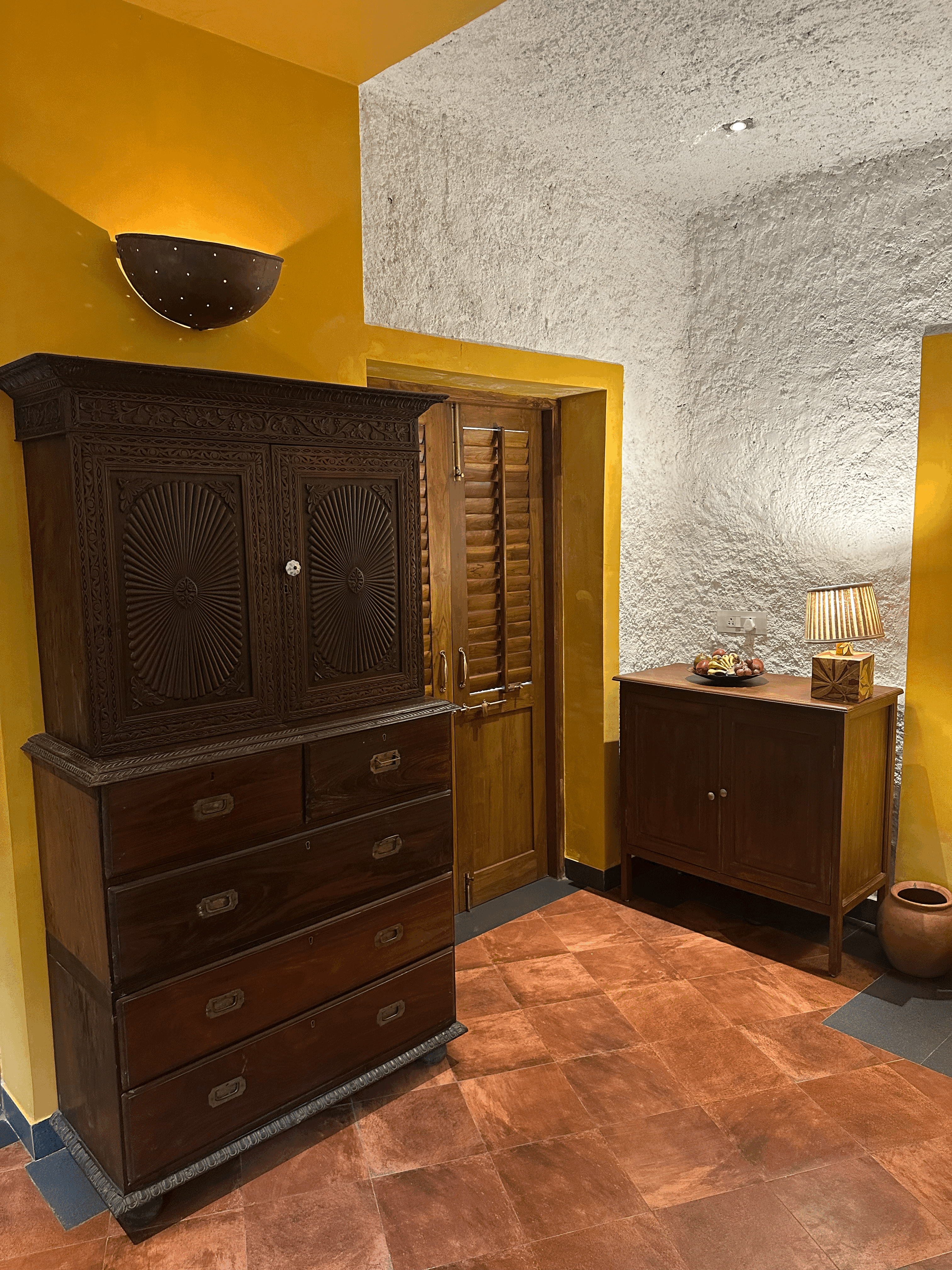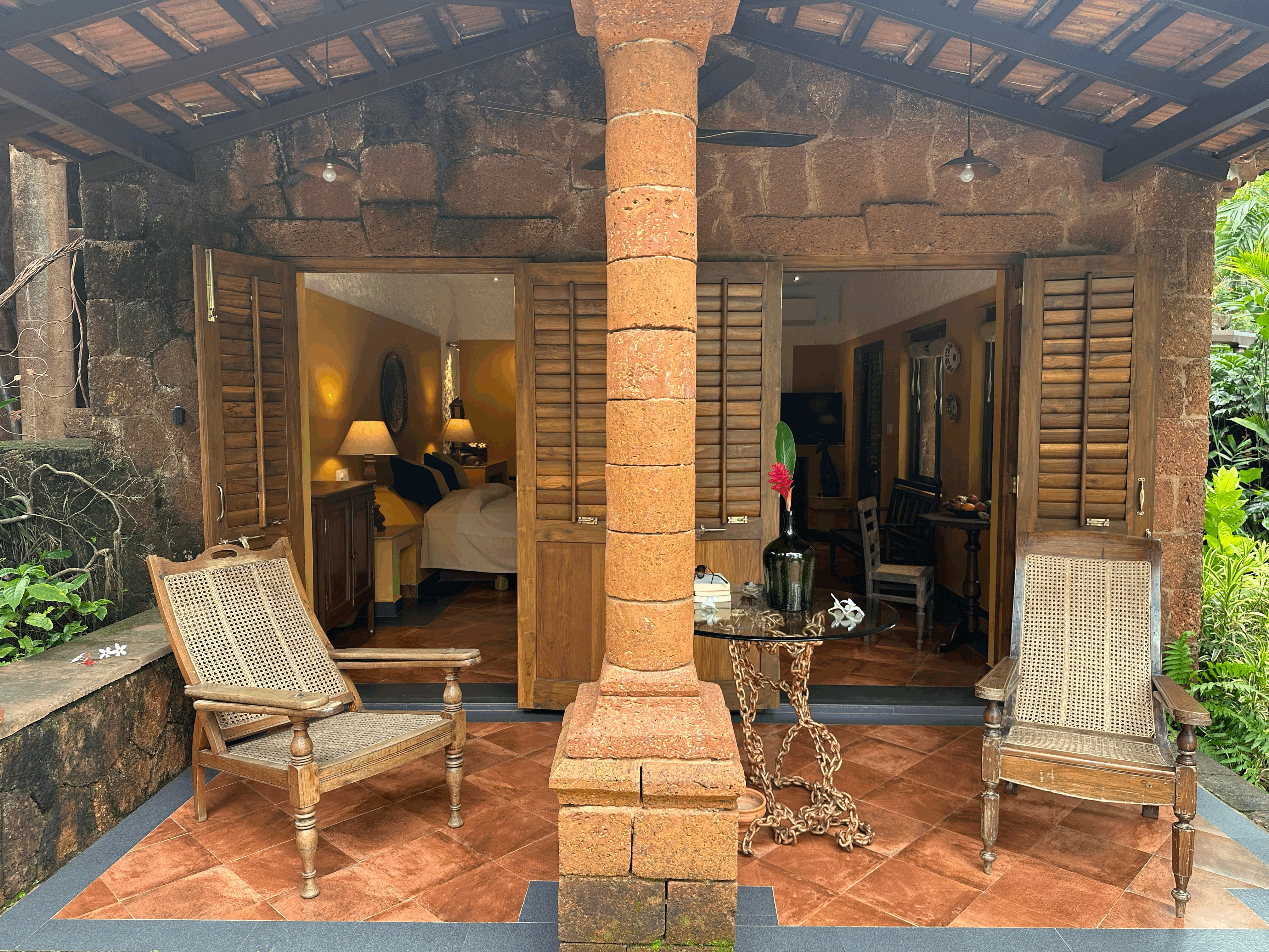 The Garden Suite is the most sought-after and popular suite of the hotel, radiating earthy warmth with its vibrant mustard yellow walls, rustic terracotta flooring, and textured white plastered ceilings. The built-in double bed, handcrafted antique furniture, including a beautifully carved antique cupboard and a unique antique dentist chair, and soft lighting create a cozy stay. This harmonious blend of heritage décor and natural tones brings the serenity of the garden indoors. Located on the ground floor, the suite opens onto a balcony furnished with a unique chain table and antique Goan cane altars (or chairs). The balcony doors are louvered, allowing for gentle airflow as you comfortably put your feet up and unwind while enjoying the lush surroundings.
