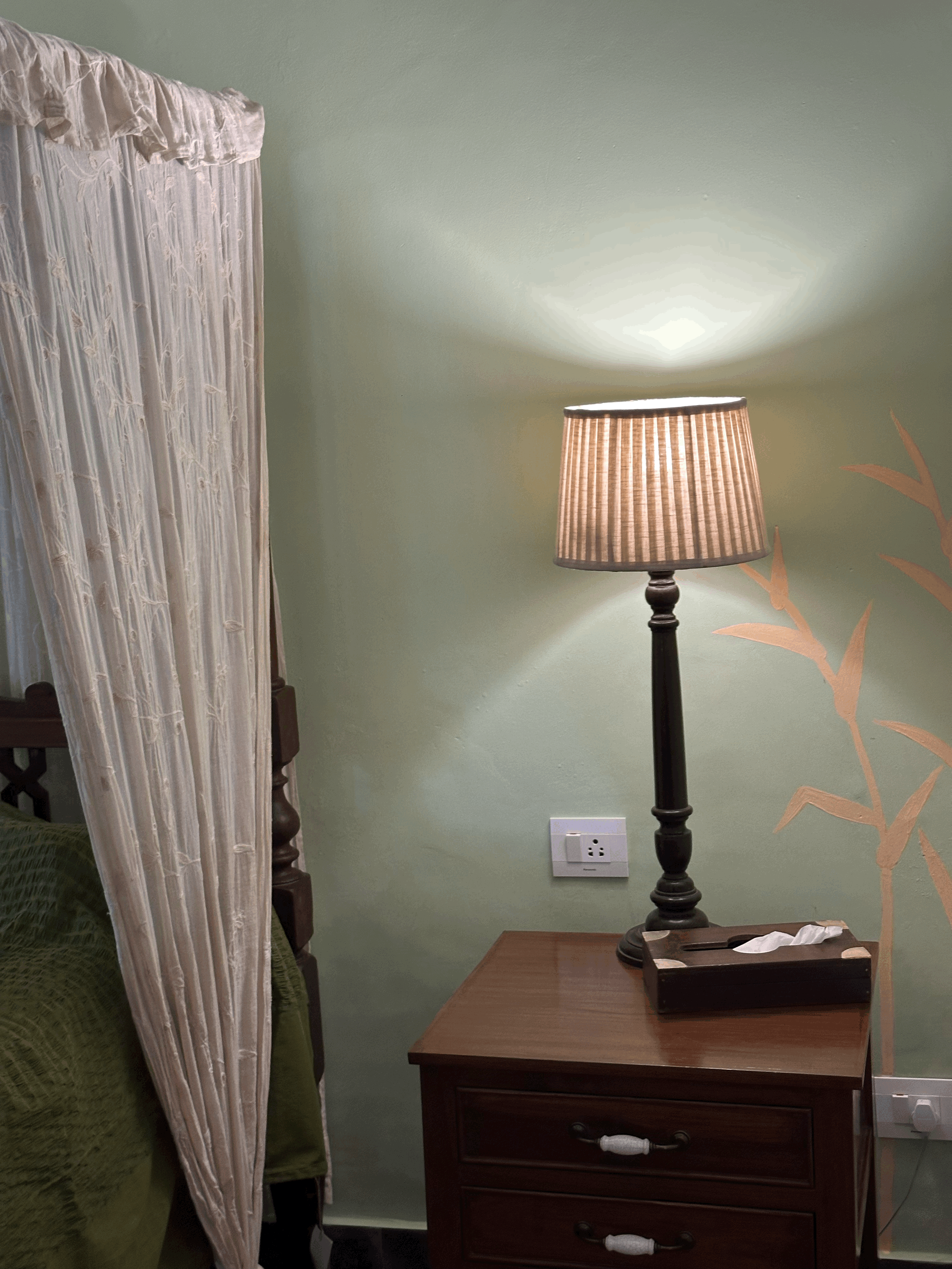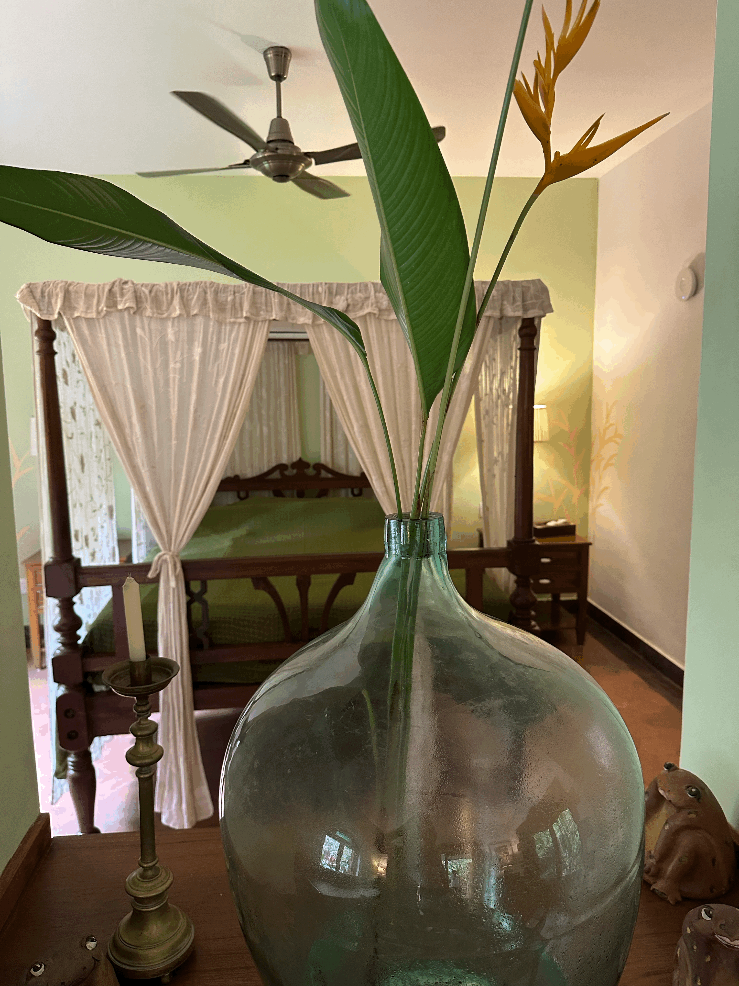 The Grassland Suite exudes an airy, pastoral charm with soft sage green walls, arched alcoves, and a dreamy four-poster canopy bed at its heart. Earthy textures, handcrafted furniture, and subtle nature motifs evoke the quiet beauty of open meadows. Sunlight streams through the windows, filling the space with a warm, natural glow that enhances its restful and romantic atmosphere. This ground-floor suite features a balcony overlooking the pool, offering a peaceful spot to relax and enjoy the serene surroundings. This room holds a special place in Pousada’s history. It became a home away from home for Lady Helen Hamlyn and Lord Paul Hamlyn of Hamlyn Publications. They first stayed in 2001, arriving by private jet and booking out the entire hotel. The suite was later modified to Lady Helen’s personal preferences, and it remains one of our most beloved and storied rooms.