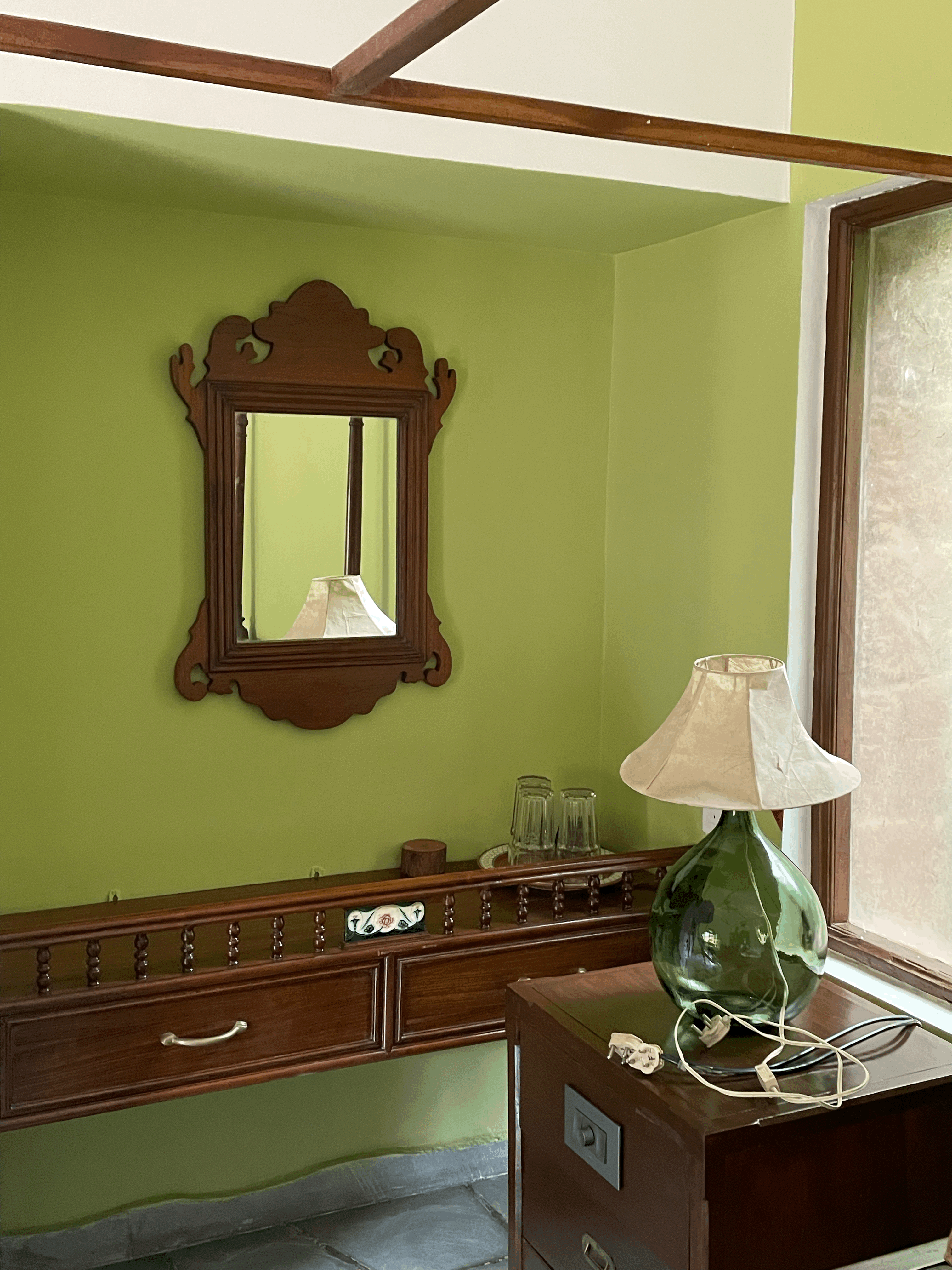 Step into the Valley Suite, a space where traditional craftsmanship meets natural beauty. This suite features unique, earthy stone flooring that complements the rustic charm of its vintage wooden furniture. A beautiful canopy bed with intricate wooden posts stands as the focal point of the room, with antique mirrors and elegant lamps adding warmth and character. Vibrant green walls and framed artwork provide a fresh contrast to the timeless wood elements, while decorative Dutch pottery on the walls reflect the rich culture of the region. The large, arched windows offer glimpses of the lush valley outside, bringing the outdoors in. Thoughtful touches like the vintage cabinet, a delicate side table with a green lamp, and a cozy sofa by the window enhance the overall comfort. The Valley Suite is the perfect retreat, blending old-world charm with tranquil surroundings for a serene stay.